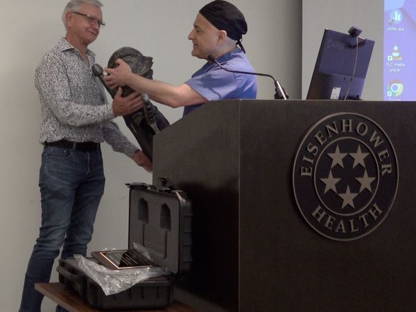Dr. Limonadi presents recognition award to Mick Griswold, PA, and CNS for his role in highest quality surgical care, and zero infection while performing the most complicated neurosurgical cases for over a decade.