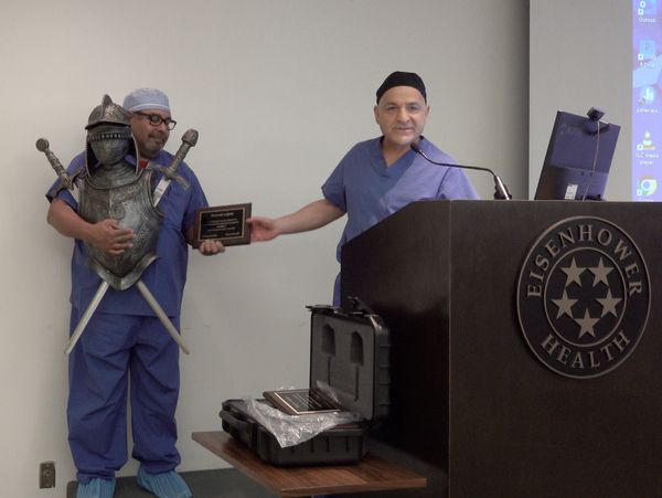 Dr. Limonadi presents recognition award to Sam Lopez, surgical technologist for his role in highest quality surgical care, and zero infection while performing the most complicated neurosurgical cases for over a decade.